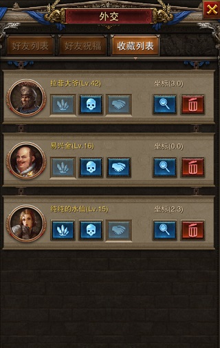 在收藏列表可以查看世界地图中收藏过的玩家的坐标,收藏列表有3个分类分别是:资源、好友、敌对,下方可以选择指定分类查看。点击右边的放大镜按钮可以快速达到指定坐标的世界地图界面,是直接攻打还是先侦查,需要您对自己实力有把握哦!
