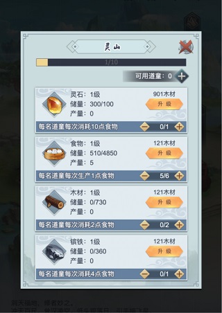 洞府中的灵山用于产出游戏中所需要的资源,而道童的分配就至关重要。开始的道童有5位,每一位道童在工作的时候都需要花费一定的食物(毕竟人家也是要恰饭的啦),而且招募道童也需要一定的量的食物。因此,优先将道童用于生产食物,同时木材的可扩展灵山中各资源产出量,而镔铁主要用于升级聚灵阵,对于玩家前期来说聚灵阵可先放一边,优先将粮食和木材的等级达到20以上。粮食充裕才能吃喝不愁。