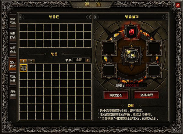 由于装备的更新换代很快,特定情况下我们必须保存珍贵的宝石。通过“锻造”界面的“宝石合成”功能,便可以摘取镶嵌在装备上的宝石。