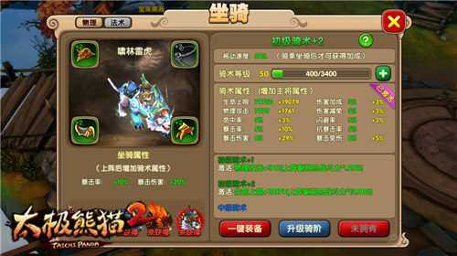 打开坐骑功能界面,左侧为坐骑栏目,六只坐骑除了外形差异外,自带属性都是相同的(暴击率10%、暴击伤害20%)。坐骑可以穿戴缰绳、背鞍、头甲、脚饰四件装备,装备属性与坐骑自带属性叠加后会显示在右侧面板,即右侧黄字属性(命中率、暴击率、暴击伤害、伤害加成、伤害减免、闪避率、抗暴击率、暴击免伤)。