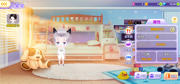 宝宝在室内时粑粑/麻麻可以对其进行吃东西、玩游戏、洗澡澡的操作;其中吃东西增加宝宝的经验值、玩游戏增加宝宝心情值、洗澡澡增加宝宝活力值。目前宝宝最高等级是5级。以后会开放宝宝更高等级,解锁更多玩法哦~