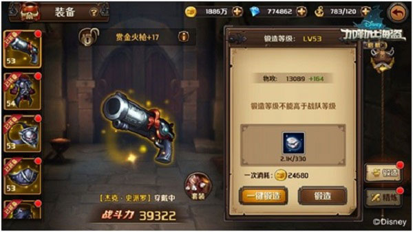 1) 锻造:消耗金币与装备锻造石提升装备的等级。装备等级不能超过当前战队的等级。