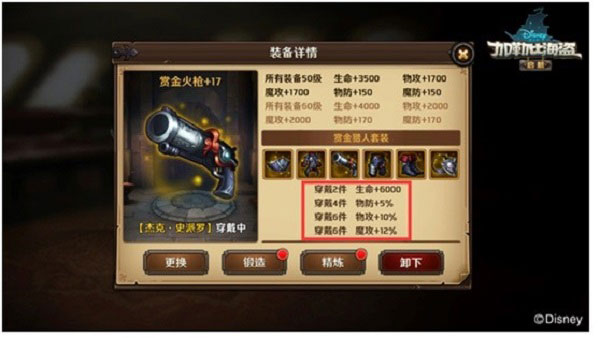 在加勒比海盗手游中,装备有6个部件:头盔、武器、衣服、裤子、饰品、鞋子;装备主要包含有几种属性,如生命、物攻、魔攻、恢复等。