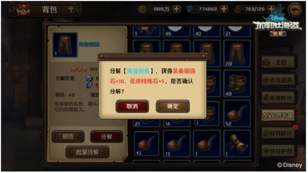 在背包中选择分解装备可获得装备强化所需道具,分解的道具获得量与装备精炼、强化等级成正比。