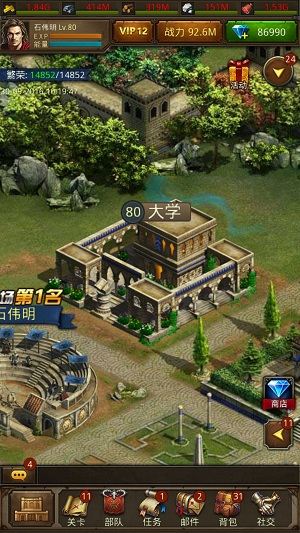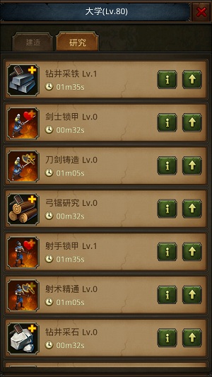 (1)大学:在城内空地块上建造,建造需消耗资源,建造有等待时间,消耗钻石可以秒掉等待时间,升级&建造建筑等待过程中需占用1个空间,空间=建筑位,升级资源不足时,允许直接使用钻石替代资源进行升级操作。