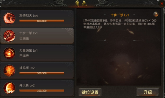 3、技能提升优先度:刺杀>攻杀>烈火>擒龙手>开天斩=冲撞等