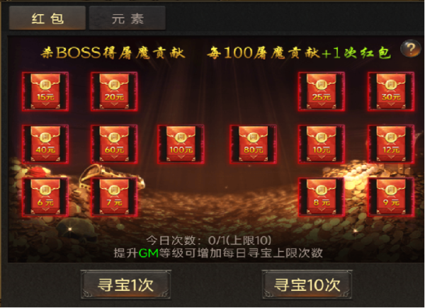 2、每击杀100只BOSS可以抽一次红包,使用红包=真实充值