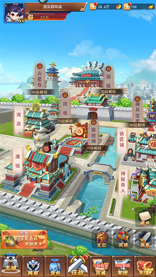 而主城界面如下,就是你作为主公所拥有的城池,有商店、占星台、竞技场等等,有些场所有等级限制,需要升级方可进入