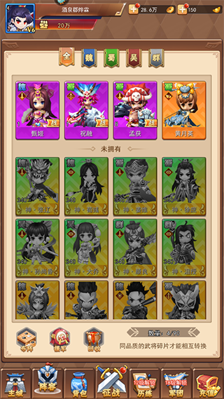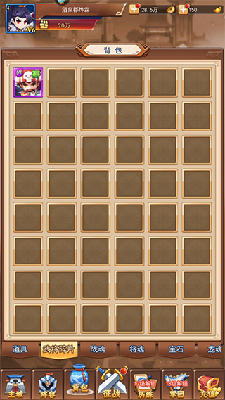 3、然后就是背包,背包中可以用来存放装备和武将的碎片还有一些用于升级的道具。背包存放有上限,各位小伙伴要记得及时清理噢,多余的装备可以回收为金币,溢出的武将碎片也可转化为别的武将碎片