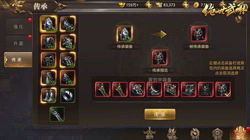 《绝世武林》传承玩法是为了帮助大家快速提升装备升星等级的一种玩法。传承,顾名思义,就是将一件装备的升星等级完全转移到另一件装备上。这样当玩家获得品质更好的装备时,就不用重新升星培养,只需利用传承玩法,就能一键搞定。