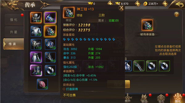 传承虽好,但并非所有装备都可进行。只有升星等级大于0的装备才可作为传承装备。且还需要传承装备升星等级大于被传承装备的升星等级。传承后,传承装备立即获得升星等级,而被传承的装备上原有的升星等级将会被覆盖掉。