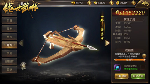 当然《绝世武林》的弩炮并非一成不变,利用弩炮进阶功能,就可进阶更换造型。而且随着品阶的提升,弩炮带来的属性加成也会逐渐提升。需要注意的是进阶跑弩炮是会消耗材料的哟~