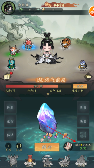 1、进入游戏,点击下图中的灵石进行解封,获取灵兽