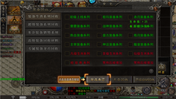 3、进入游戏跟随新手指引,选择全选本页,这样打怪掉落的装备都会自动拾取,不用浪费我们的时间,也不会遗漏稀有装备。