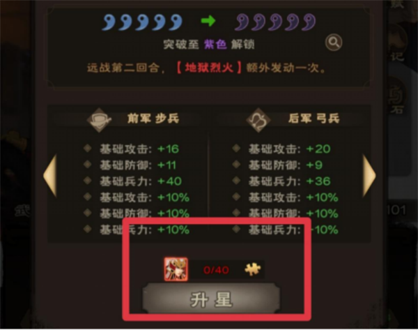1、武将初始激活为蓝色品质,蓝色满星后需要40片碎片突破至紫色。