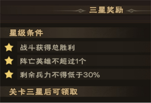 注意一点,阵亡武将不超过一个,也就是说允许阵亡一个武将,而本副本需要上阵的武将数量较多,萌新们没有资源培养那么多武将,本副本所对阵的npc战力是从高到低排列的,所以我们可以把上阵武将中战力最低的一位武将放在最前方,以“田忌赛马”的方式取得满星。另外一点,萌新们可以考虑一下武将之间的职业克制关系。