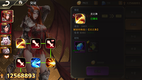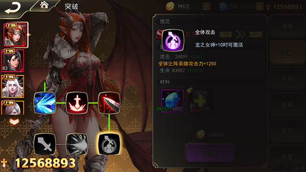 就拿我们的橙色英雄来说,突破1级会解锁英雄的特殊技能,突破7级则会解锁光环增益,突破11解锁则会大幅度强化英雄技能,之后的每次强化都会超大幅度的提升英雄or团体的属性,但是所付出的消耗品数量也是非常巨大的。