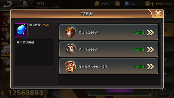 英雄突破:英雄突破是英雄提升战斗力的一个重要途径,通过英雄突破可以使英雄获得更多的能力,而紫色英雄突破满级10,紫色以上英雄突破满级为12级。英雄突破需要消耗突破石、金币和大量英雄碎片,而随着消耗物品的越来越多,突破所带来的属性加成也是呈阶梯状上升。