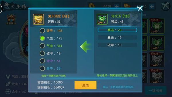 如果前面两种都没有,那么再留意右边的属性有没有普遍比左边中最低的一项属性高。因为洗练是随机挑选右边中的一项属性,所以只有一项较高,其他很低的,洗练时候成功率就没那么高。不过洗错了,戳回来咯。
