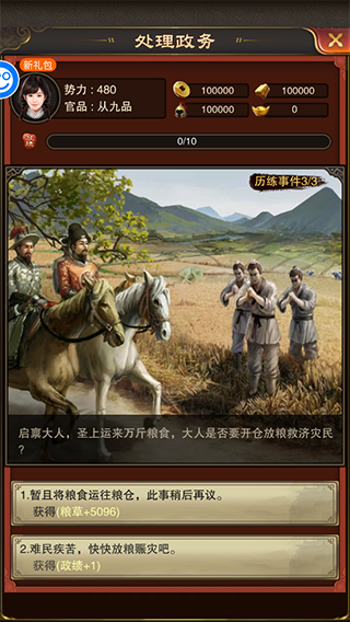 天之命0.05折是有趣的古风经营养成手游,以明朝历史为背景,玩家沉浸式扮演明朝官员。游戏当官玩法多样,玩家能体验判案的公正威严,还需处理政务升官,感受官场变化。豪侠派遣玩法独特,众多明朝豪侠属性定位各异,玩家按需派遣,助力官场晋升。后宫争宠玩法添趣味,玩家在政务之余体验别样宫廷生活。