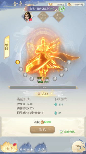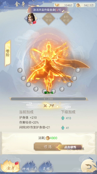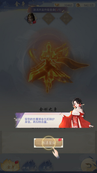 1、玩家修炼到一定境界后,就可以激活金身修炼,战斗力更加强劲。