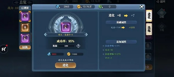 通过培养铭文,还可以进一步解锁铭文的隐藏属性。通过进化,可以有效提升铭文属性,消耗道具【铭文精华】和金钱对铭文进行进化,进化等级越高,属性加成也随之提升,当进化次数达到特定等级后,还能获得额外的属性加成。不仅如此,收集并佩戴同一系列的铭文,可激活铭文套装的隐藏属性,获得额外增益。