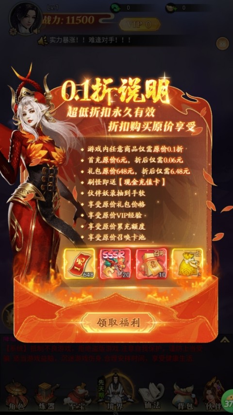3、登录就送0.1超低永久折扣,充值券、坐骑碎片等