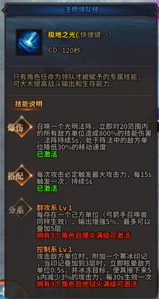 每个职业都拥有一个专属的领队技,分别为法师-极地之光、剑士-审判之剑、弓箭手-净化之力。