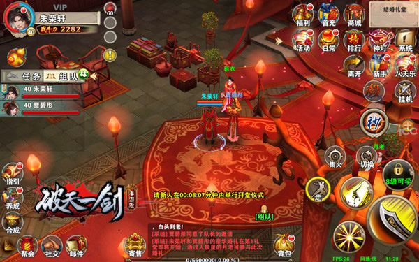 进入结婚场景后,新郎与新娘换会自动换装成结婚装束,并开始倒计时,二人需要在时间内完成拜堂仪式,队长可点击彩衣选择开始拜堂。