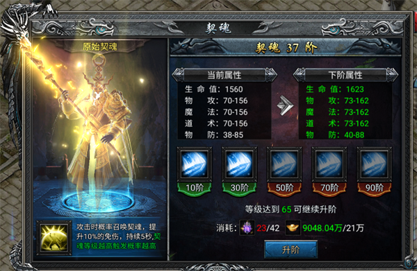 原始契魂(攻击时概率召唤契魂,提升10%的免伤,持续5秒,契魂等级越高触发概率越高)