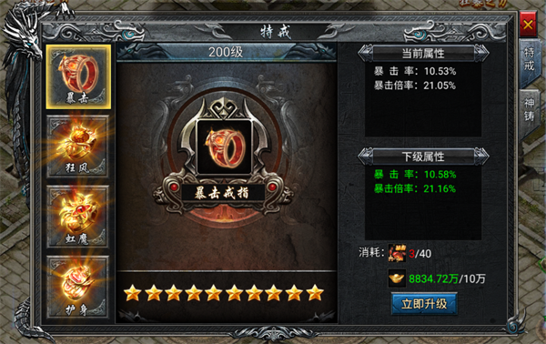 特戒分为神剑,暴击,狂风,虹魔,护身,每个都拥有着不同的专属属性,每提升一级都会提升相对应属性,提升特戒需要对应数量的特戒碎片和元宝。特戒还可以进行神铸,神铸分为金木水火土,伴随着神铸的等级提升,属性也大幅度提升。