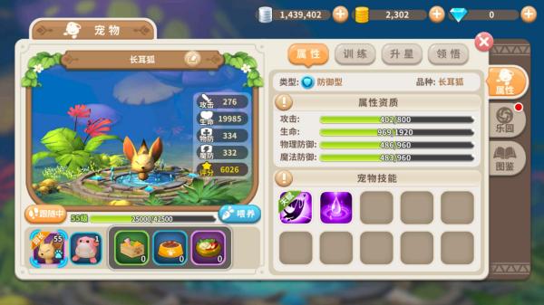 可以看到,皮皮骚55级的长耳狐已经拥有276点攻击,19985的生命,334的物理防御以及332的魔法防御。而在乐园玩法中将长耳狐设定在不同的位置则可以获得不同的属性,其中的爱心园长更是全属性继承哦,直接让你的战力飙升。
