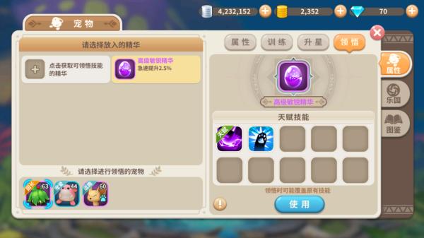 在宠物界面的属性面板中,可以看得到宠物目前的等级以及一个基础的属性值的情况,而玩家可以通过点击宠物栏上的喂食按钮对宠物进行喂食,也就是升级。